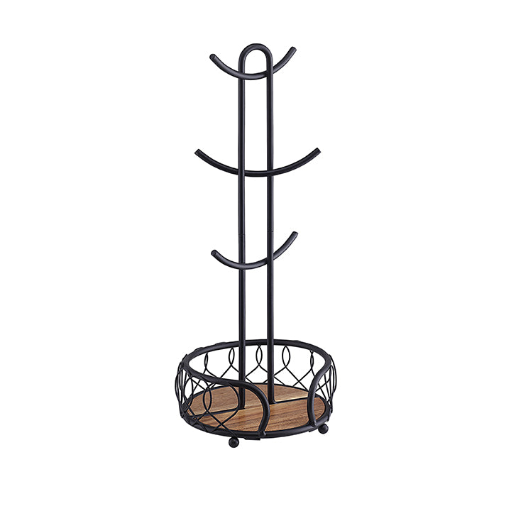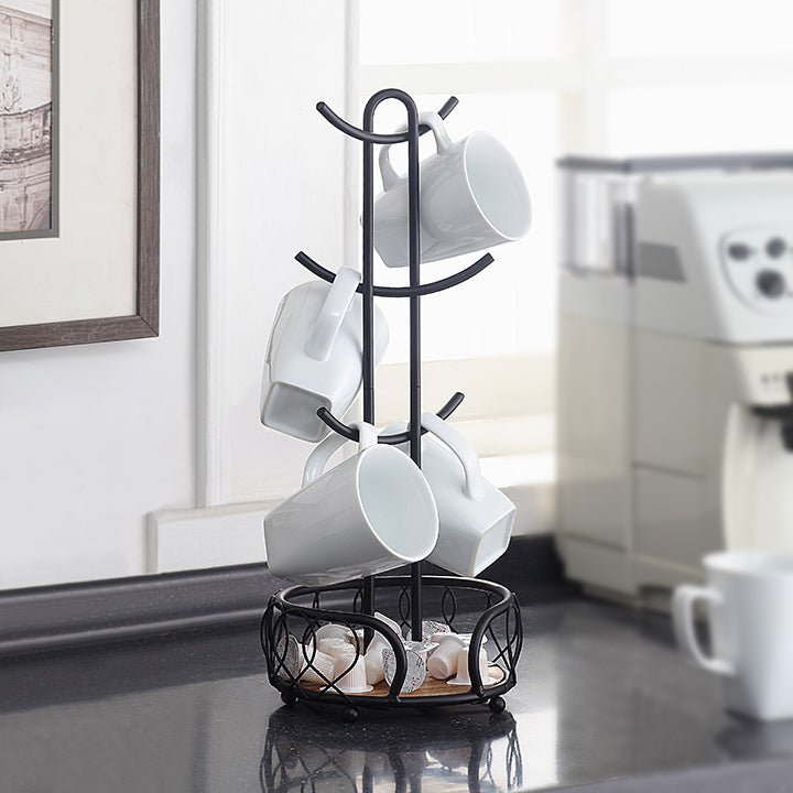 Heavy Wire Gauge 6 Mug Tree Countertop Holder, Coffee Mugs and Tea Cup Storage Rack with Small Storage Area (Mat Black, 18.2 x 7 x 7 Inch)
